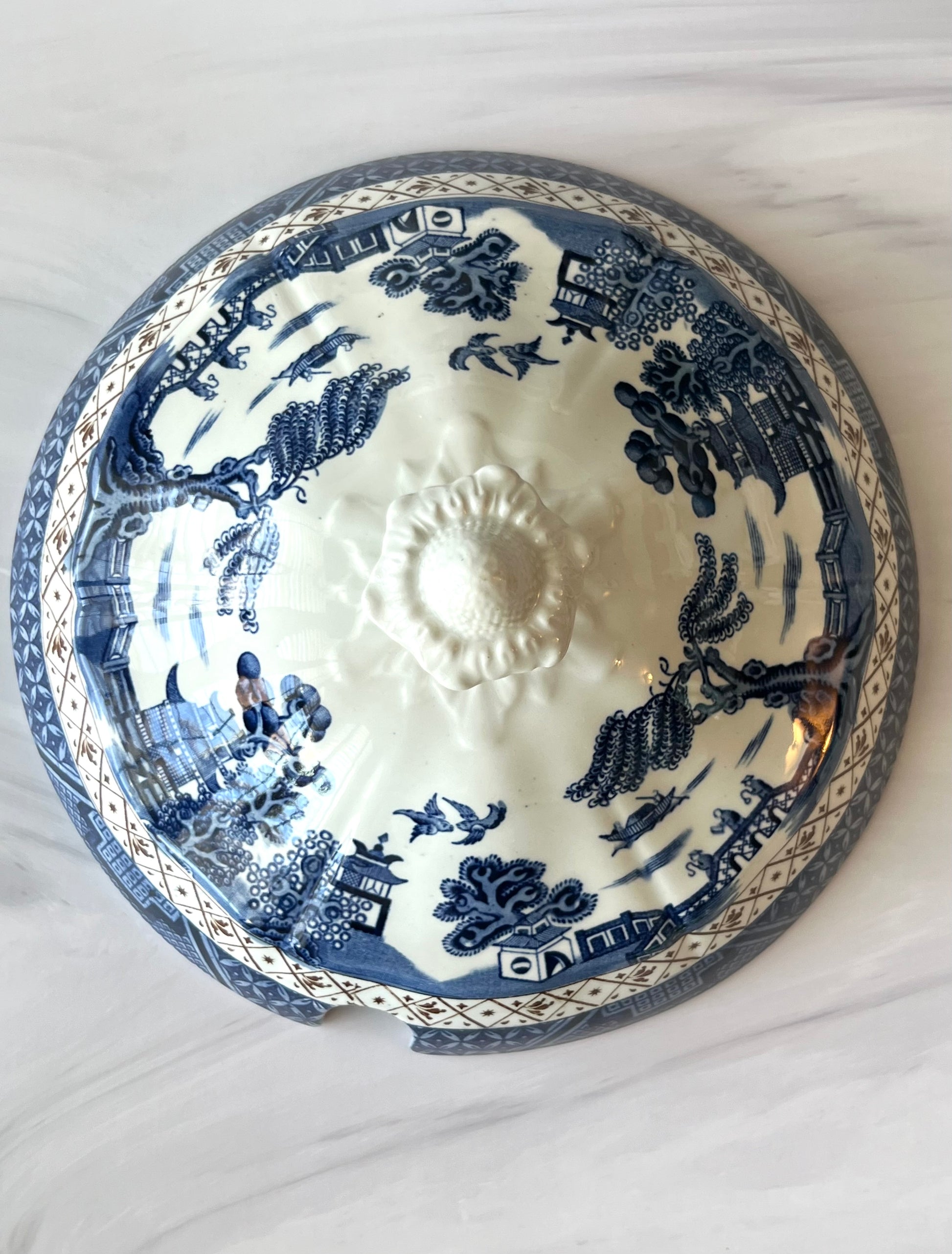 With its sculptural scroll handles, traditional willow landscape, and richly layered border work, this piece carries the quiet authority of mid-20th century English china. It makes a striking statement on a dining table, sideboard, or open hutch — equally suited for serving or display.